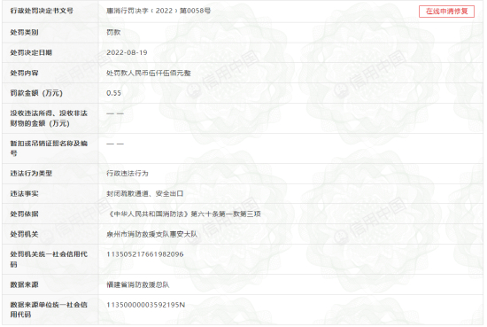 来自福建省消防救援总队的行政处罚决定书披露,华福证券有限责任公司惠安东南街证券营业部(简称:惠安东南街营业部),存在“封闭疏散通道、安全出口”的情况。因违反《中华人民共和国消防法》第六十条第一款第三项规定,2022年8月,泉州市消防救援支队惠安大队对其罚款5500元。