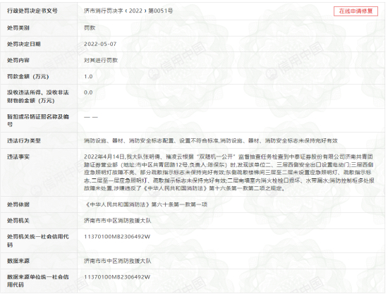 2022年4月,济南市市中区消防救援大队现场检查了中泰证券济南共青团路证券营业部(简称:共青团路营业部)。因消防设施、器材、消防安全标志配置、设置不符合标准,消防设施、器材、消防安全标志未保持完好有效,对其罚款1万元万元。