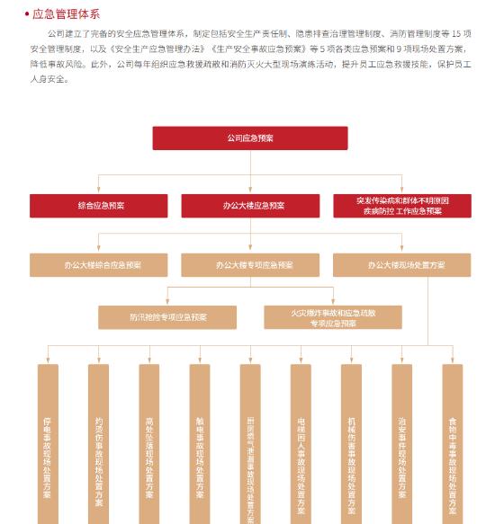 同时,中泰证券建立了安全应急管理体系,制定包括安全生产责任制、隐患排查治理管理制度、消防管理制度等15项安全管理制度,以及涉及火灾事故的应急预案。组织应急救援疏散和消防灭火大型现场演练活动,提升员工应急救援技能,保护员工人身安全。