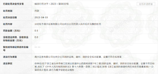 信用中国显示,2022年以来已有四家券商因为消防问题受到公开处罚。其中,最近的一起发生在2023年4月,来自宁波籍券商甬兴证券有限公司台州分公司(简称:台州分公司)。