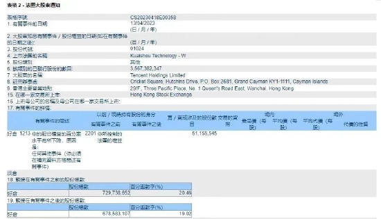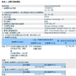 据港交所披露文件:4月13日,腾讯在快手的持股比例从20.46%降至19.02%。