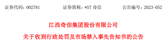 4月19日晚,江西奇信集团股份有限公司(*ST奇信,002781)发布公告,收到证监会《行政处罚及市场禁入事先告知书》。告知书显示,*ST奇信涉嫌欺诈发行,且上市后连续5年财务造假,8年虚增利润超26亿,招股说明书及定期报告均存在虚假记载,公司涉嫌信息披露违法违规,公司债券发行文件亦涉及编造重大虚假内容。公司拟被罚5000万,相关责任人被罚100万元到1400万元不等,其中财务部职员也被罚200万。
