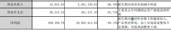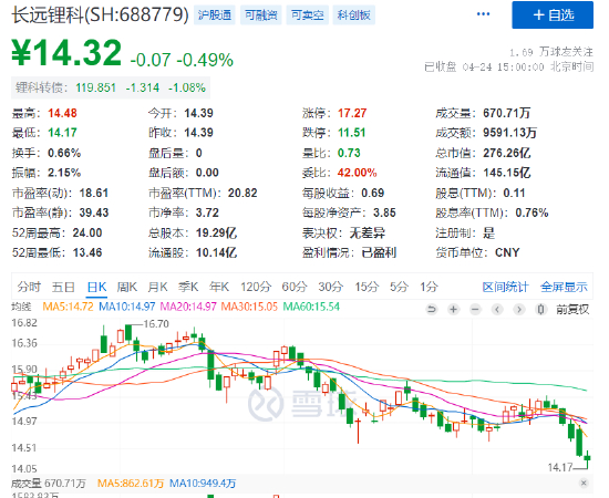 此外,两百亿市值的长远锂科也发了一季度的报告,公司一季度实现营业收入约为19.34亿元,同比下降42.99%;对应实现的归属净利润约为92.94万元,同比下降99.69%。
