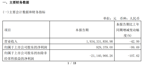 长远锂科:一季度净利润92.9万元 同比下降99.69%;