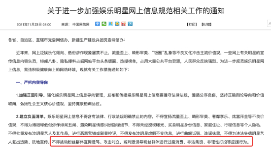 2021年11月,网信办发布《关于进一步加强娱乐明星网上信息规范相关工作的通知》,要求不得挑动粉丝群体互撕谩骂、攻击对立,或刺激诱导粉丝群体进行过度消费、非法集资、非理性打投等应援行为。