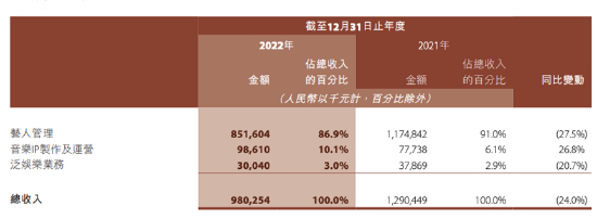 2022年,乐华娱乐的主要收入仍然来自艺人管理、音乐IP制作及运营、泛娱乐三大块。其中艺人管理收入8.52亿元,虽然仍占公司收入的87%,但该项收入实际同比下降了27.5%。