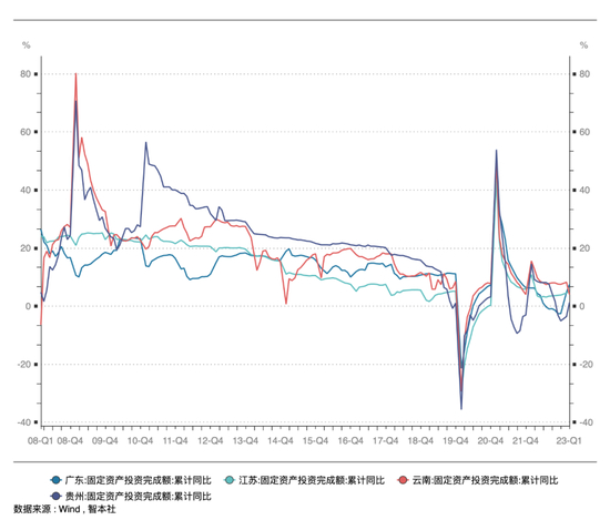 图:广东、江苏、云南和贵州固定资产投资,来源:wind 智本社