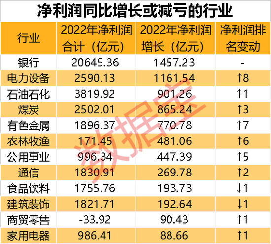 其他行业方面,银行多年来稳坐行业盈利榜首位,2022年行业超预期增长,整体利润明显增厚,在营收增长411.66亿元的前提下,净利润大增1457.23亿元,超九成银行股2022年盈利提升。非银金融、房地产分别受到市场行情和整体经济形势的影响,净利润下降超千亿元。