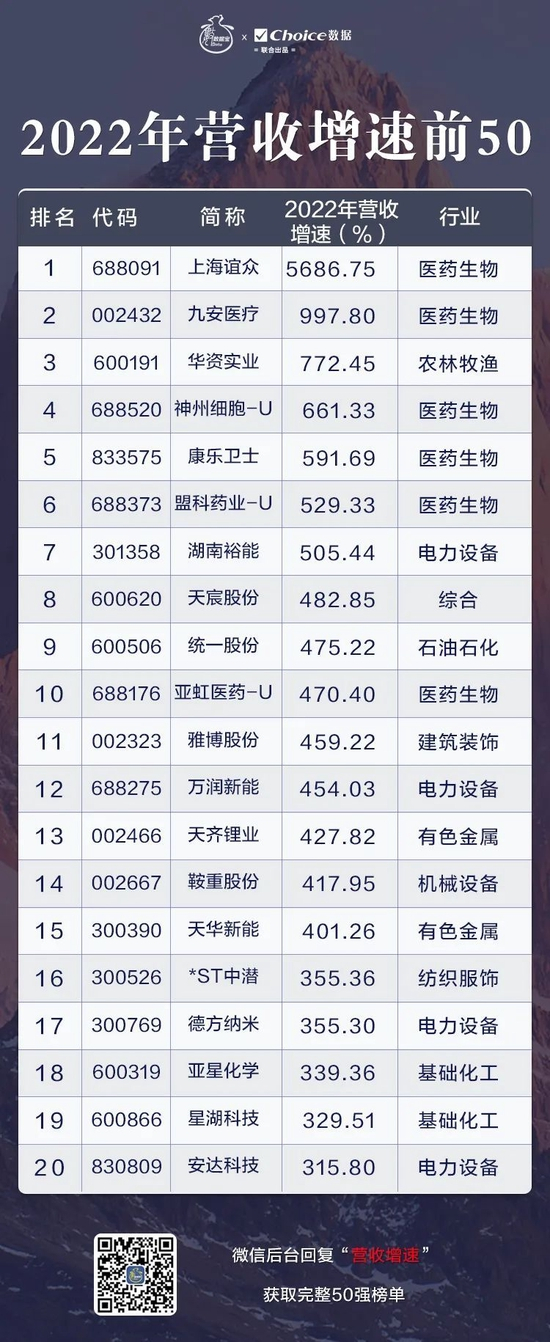 统计显示,2022年共有118股实现营收翻倍,上海谊众、九安医疗、华资实业、神州细胞-U、康乐卫士、盟科药业-U、湖南裕能营收增长率在500%以上。