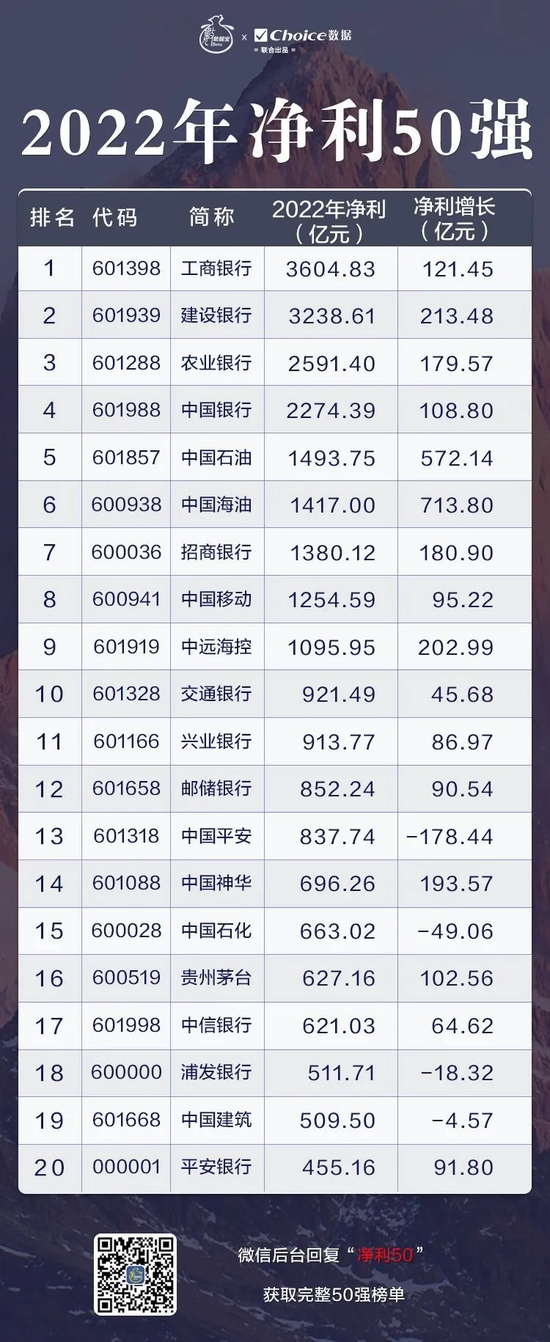 2022年,净利润排名前50的上市公司合计盈利3.37万亿元,较2021年增加约3000亿元。9家公司净利润跨过千亿元俱乐部门槛,较2021年增加两家,其中中国石油、中国海油、中远海控3家为2022年新进,中国平安在2018年以来首次降到千亿以下。