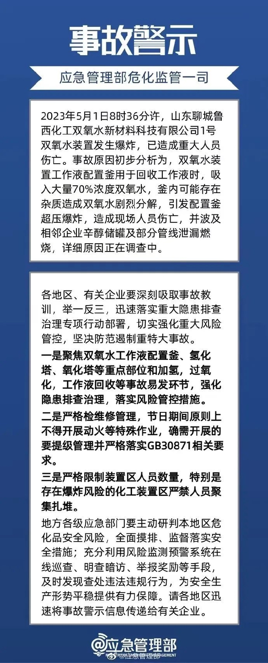 5月2日,应急管理部也就此事作出回应,本次事故原因初步分析为,双氧水装置工作液配置釜用于回收工作液时,吸入大量70%浓度双氧水,釜内可能存在杂质造成双氧水剧烈分解,引发配置釜超压爆炸,造成现场人员伤亡,并波及相邻企业辛醇储罐及部分管线泄漏燃烧,详细原因正在调查中。