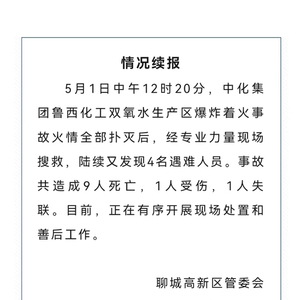 记者注意到,本次事故发生后,微信公众号“聊城高新区”已两次发布通报,5月3日下午的最新通报显示,事故火情全部扑灭后,经专业力量现场搜救,陆续又发现4名遇难人员。事故共造成9人死亡,1人受伤,1人失联。目前,正在有序开展现场处置和善后工作。