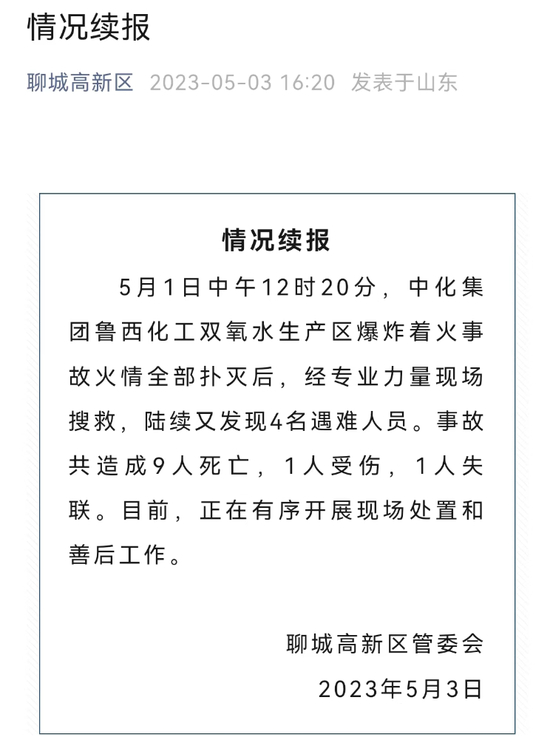 5月3日下午的消息显示,山东省政府已成立由山东省应急厅、省工信厅、省公安厅、省总工会、省消防救援总队和聊城市政府等部门和单位组成的中化集团聊城鲁西双氧水新材料科技有限公司“5·1”爆炸着火事故调查组。