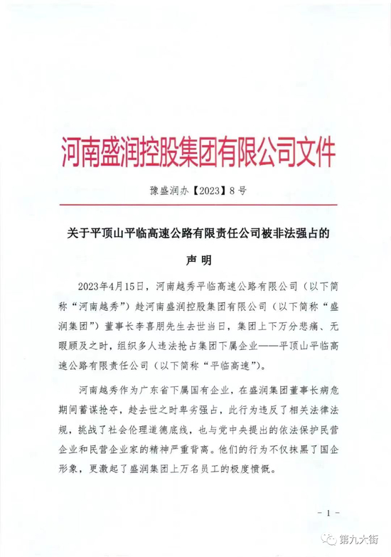 4月24日,河南盛润控股集团有限公司(下称盛润集团)公开声明称,平顶山平临高速公路有限公司(下称平临高速公司)被河南越秀平临高速公路有限公司(下称河南越秀)非法强占。