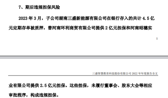*ST三盛子公司湖南三盛新能源有限公司在银行存入的4.5亿元定期存单被质押,其中有2.5亿元为河南环利商贸有限公司提供担保,给河南昭穗实三盛智慧教育科技股份有限公司提供2.5亿元担保。