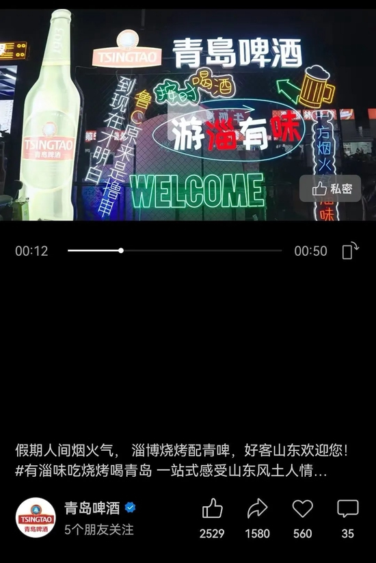 近日,青岛啤酒通过官方视频号放出了数段淄博烧烤宣传视频。视频中,食客们热情地举起酒杯,青岛啤酒标志清晰可见。此外,青岛啤酒还通过设置打卡点的方式与消费者们互动。