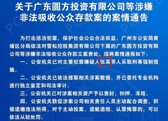 据广州市公安局黄埔分局5月7日公告称,雪松控股集团有限公司下属的广东圆方投资有限公司等,因涉嫌非法吸收公众存款已被立案查处。