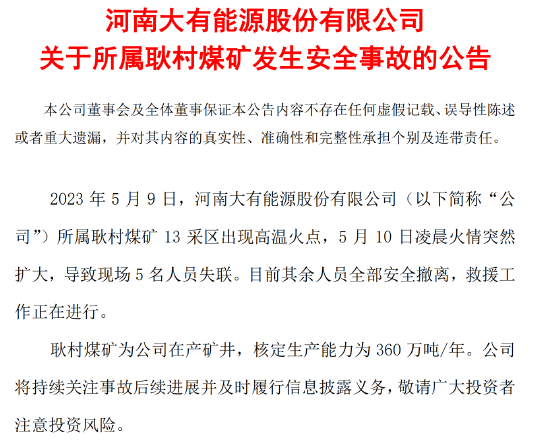 突发!大有能源公告火情事故,5人失联