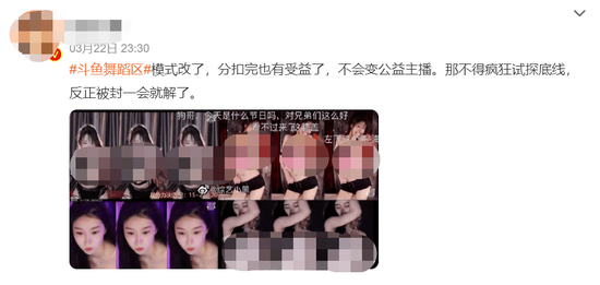 今年3月31日,“斗鱼官方推送软色情表演”“斗鱼舞蹈区”等话题接连登上微博热搜榜,原因是斗鱼颁布了新的舞蹈区规定,出现了很多软色情擦边直播。
