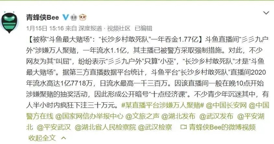 ▲媒体有关斗鱼直播间涉赌的消息,图片截自微博。