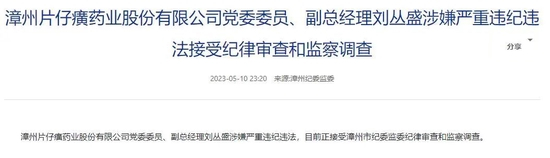 5月10日晚间,记者从漳州纪委监委官网获悉,漳州片仔癀药业股份有限公司原董事长潘杰、现任副总经理刘丛盛两人涉嫌严重违纪违法,目前正接受漳州市纪委监委纪律审查和监察调查。