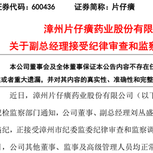 5月11日,片仔癀发布公告称,公司董事、副总经理刘丛盛因涉嫌严重违法违纪,正接受漳州市纪委监委纪律审查和监察调查。同日,片仔癀前任董事长潘杰也遭到漳州市纪委监委调查。