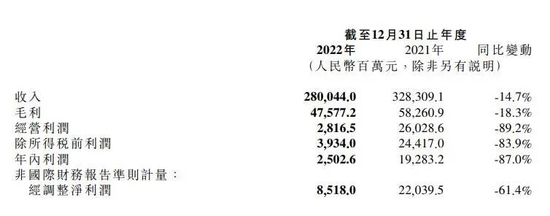 据小米3月份发布的2022年第四季度及全年财报,第四季度,小米实现营收660.47亿元,同比下降22.8%,经调整净利润为14.6亿元,同比下降67.3%。全年来看,2022年度,小米集团总收入为2800亿元,较上年同期的3283亿元下降14.7%;经营利润为28.16亿元,较上年同期的260.28亿元大跌89.2%。