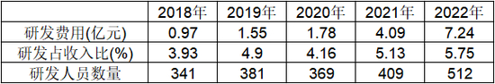 从研发角度来看,公司在研发方面的投入还是舍得的。2021年,公司研发支出4.09亿,2022年公司研发支出7.24亿,同比增长77%,研发人员数量也在稳定增加,同时研发支出占总营收的占比也在升高。