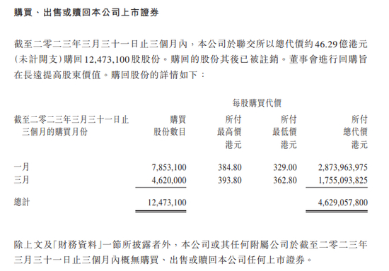 截至2023年3月31日的三个月内,腾讯已回购了约46.29亿港元股份,购回的股份已被注销。公司表示,董事会进行回购旨在长远提高股东价值。