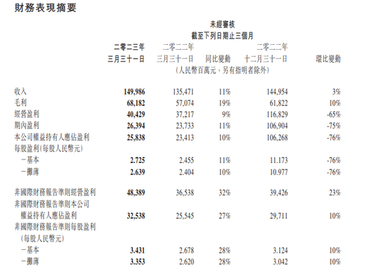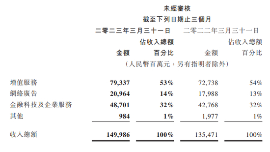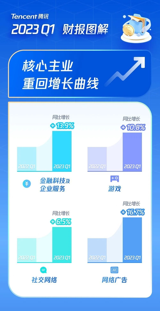 腾讯控股17日发布2023年第一季度财报,公司该季度实现收入1499.86亿元,同比增长11%;净利润(非国际会计准则下,Non-IFRS)达到325.38亿元,同比增长27%。财报显示,第一季度,金融科技与企业服务、广告、游戏三大核心业务收入增幅均超过10%;其中,企业服务收入同比增速转正,国际市场游戏收入再创历史同期新高,本土市场游戏收入实现了2022年第一季度以来的首次同比增长,可谓喜讯频传。而“三大引擎”的集体发力,正带动腾讯重回增长轨道。