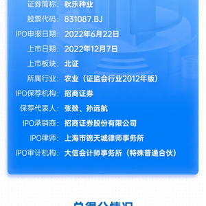 2022年12月7日,秋乐种业在招商证券的保荐下,顺利在北交所上市,登陆A股。