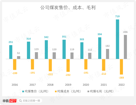 2022年,吨煤综合售价已达到719元/吨,毛利也是7年新高的436元/吨。