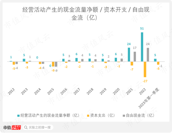 不过,由于2021-22年经营活动产生的现金流量净额充足,所以在资本开支重金投入后,依然是自由现金流最充裕的两年,2022年自由现金流为史上最高的24亿。