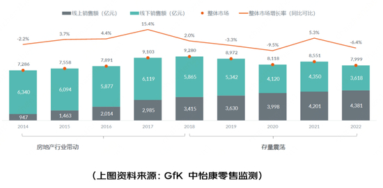 2014年至2018年,在房地产行业的带动作用下,中国纯家电市场规模进入了正向增长期,2017年同比增速一度达到15.4%。而在2018年后,房地产行业兴盛周期结束、全球产业链波动影响原材料成本、疫情等不利因素纷纷出现,家电市场也进入了存量震荡的阶段。