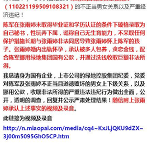那是2020年5月11日及其后几天,一个名叫史睿生的男子,在个人微博上先后发布的实名举报信声称,绿地集团现任高管、70后陈军,跟其合法妻子、绿地集团现任员工、95后张雨婷,发生不正当男女关系并致其怀孕;陈军在绿地内部有洗钱、贪腐操作,且手握9000万元现金。