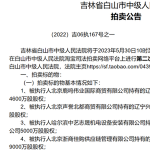 事实上,以上巨额股权已经是第二次司法拍卖,按第一次合计约7.15亿元的起拍价格计算,合计约6.44亿元的最新起拍价已经打了九折。而第一次拍卖时,上述股权遭遇了流拍。