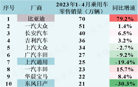 今年1-4月,比亚迪以70万辆的乘用车零售销量与79%的同比增长保持领先,是国内乘用车零售销量TOP10中唯一实现大幅增长的车企,其余九家车企销量或小幅增长,或小幅下滑,整体表现并不亮眼。