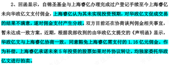 在上述数据的支持下,提前准备好的上海睿亿完全有机会取得很好的收益率。但根据上市公司的回复,由于上海睿亿对华政亿文促成交易的结果不满意,未实现预期投资收益,一直拒绝支付佣金。