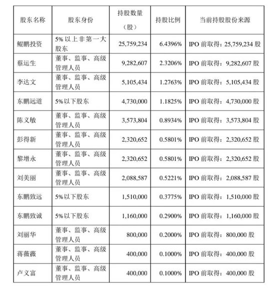 公告显示,公司股东鲲鹏投资、蔡运生、李达文、东鹏远道、陈义敏、彭得新、黎增永、刘美丽、东鹏致远、东鹏致诚、刘丽华、蒋薇薇、卢义富因自身资金需求,计划以集中竞价交易方式和大宗交易方式减持公司合计不超过3574.15万股,即不超过公司总股本的8.9352%。