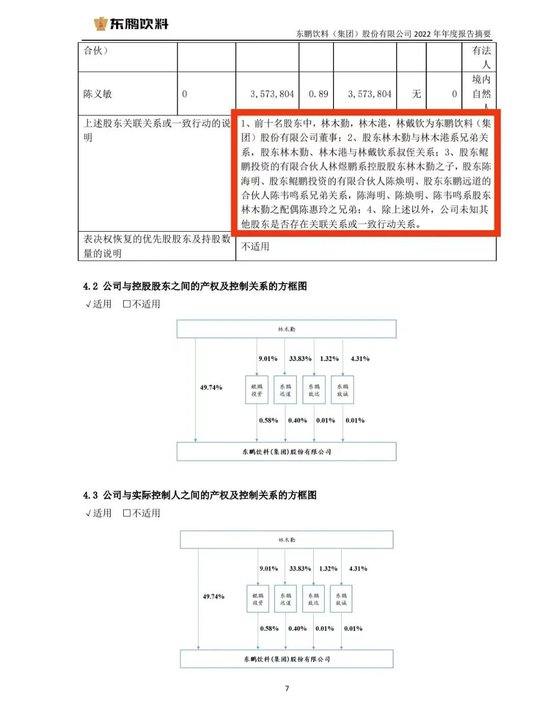 根据东鹏饮料2022年财报显示,前十名股东中,林木勤、林木港、林戴钦为公司董事,林木勤与林木港系兄弟关系,林木勤、林木港与林戴钦系叔侄关系,鲲鹏投资的有限合伙人林煜鹏系控股股东林木勤之子,陈海明、鲲鹏投资的有限合伙人陈焕明、东鹏远道的合伙人陈韦鸣系兄弟关系,陈海明、陈焕明、陈韦鸣系股东林木勤之配偶陈惠玲之兄弟。
