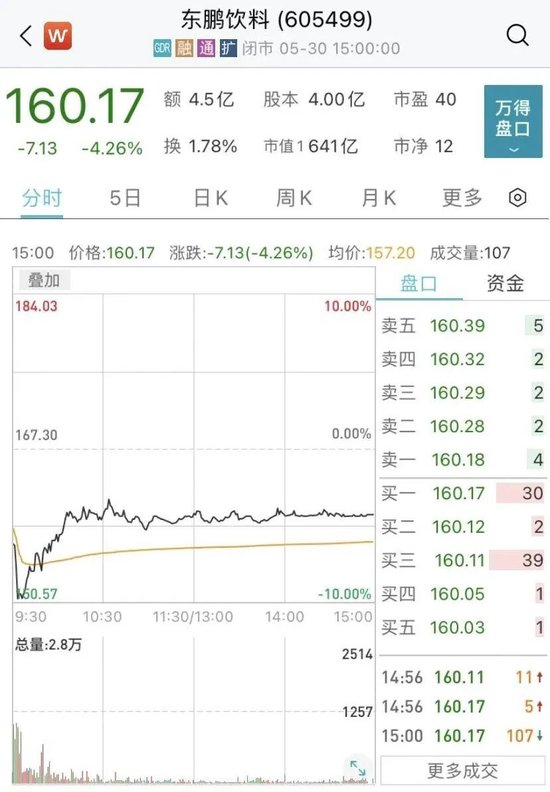 所持股票才刚刚开始上市流通,股东们就迫不及待的要套现了?消息一出,立即引发二级市场的震荡。5月30日,东鹏饮料股价在盘中触及跌停,截至收盘,股价跌4.26%,报160.17元/股,市值为640.70亿元。