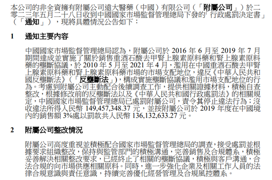 此外,上市公司还表示,市场监管总局的处罚金额,占集团最近一个财政年度营收和净利润的比例分别为约3.48%和15.85%,预期不会对集团生产经营产生持续影响。