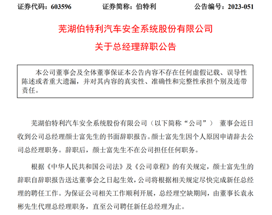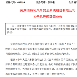 5月31日晚间,伯特利发布公告,总经理颜士富因个人原因辞去相关职务,辞职后将不在公司担任任何职务。总经理空缺期间,将由董事长袁永彬代为履职。
