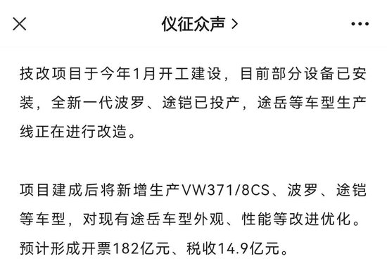 而在仪征官方2023年年初的一篇新闻报道里,显示上汽大众仪征工厂技改项目正加速推进。该项目位于仪征市汽车工业园,总投资23.3亿元,由上汽大众汽车有限公司投资建设。