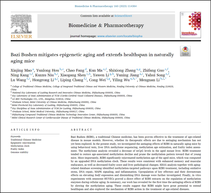 八子补肾是以岭药业应用络病理论指导研发的OTC甲类药品,是治疗肾精亏虚、精不化气、气不化神的代表性品种。而其通过逆转DNA甲基化抗衰老的功效已在科学实验中得到验证,相关学术论文《八子补肾延缓自然衰老小鼠表观遗传衰老并延长其健康寿命》也发表在国际药学领域SCI期刊《生物医学与药物治疗》(Biomedicine & Pharmacotherapy,影响因子7.419)上。