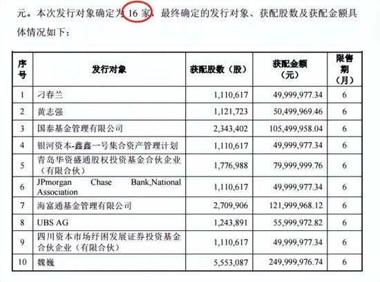 2022年12月,明冠新材发布《2022年度向特定对象发行A股股票上市公告书》,其中显示,定增发行价格45.02元/股,募集资金总额16.75亿元,发行对象共有16名。