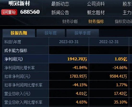 业绩上看,2022年,明冠新材实现营业收入17.42亿元,同比增长35.10%;归母净利润1.05亿,同比下滑14.66%。2023年一季报显示,公司营收4.01亿元,同比上升4.65%;归母净利润1942.7万元,同比下降41.84%。