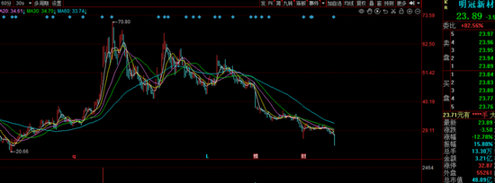 6月6日早盘,明冠新材开盘快速下挫,截至收盘报价23.89元,跌12.78%,总市值48.09亿元。2022年8月29日,明冠新材曾创下70.80元高点,最近股价相比之下跌幅66%。
