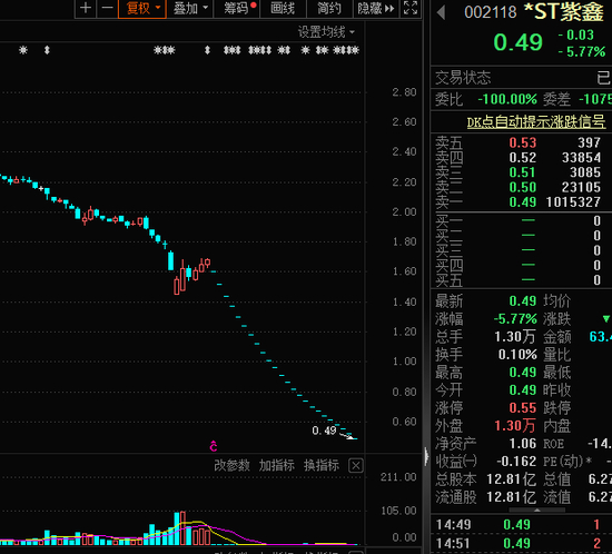 以*ST紫鑫为例,该股已连续14个交易日收盘价低于1元,最新股价创历史新低。即使该股后续6个交易日连续涨停,也无法达到1元之上,退市已经板上钉钉。*ST紫鑫是被誉为“东北人参之王”的中药材企业,股价巅峰时曾超过16元,如今被披星戴帽,最新市值只剩6.28亿元。