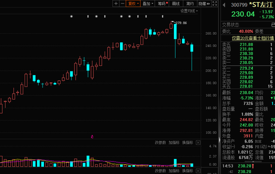 6月7日上午盘中,*ST左江股价再度闪崩,一度跌超18%,随后被快速拉起,跌幅收窄。截至收盘,该股跌5.73%,股价报收230.04元/股。